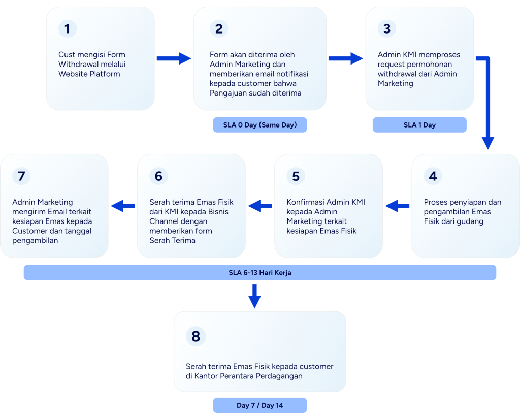 - Jangka waktu layanan penarikan adalah 7-19 hari kerja setelah kustomer menerima notifikasi email bahwa penarikan emas fisik sedang diproses. Khusus bagi penarikan emas batangan fisik produk luar negeri, dimungkinkan terjadi waktu yang lebih lama